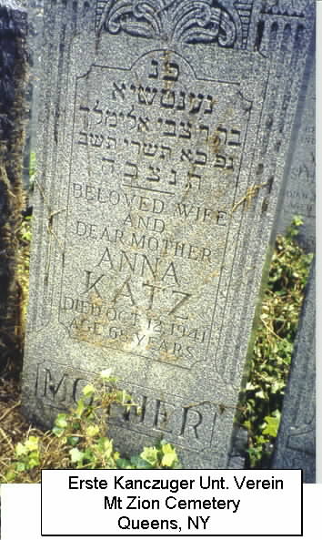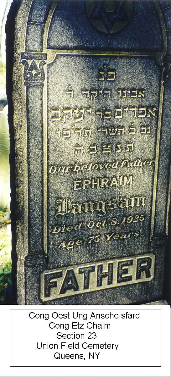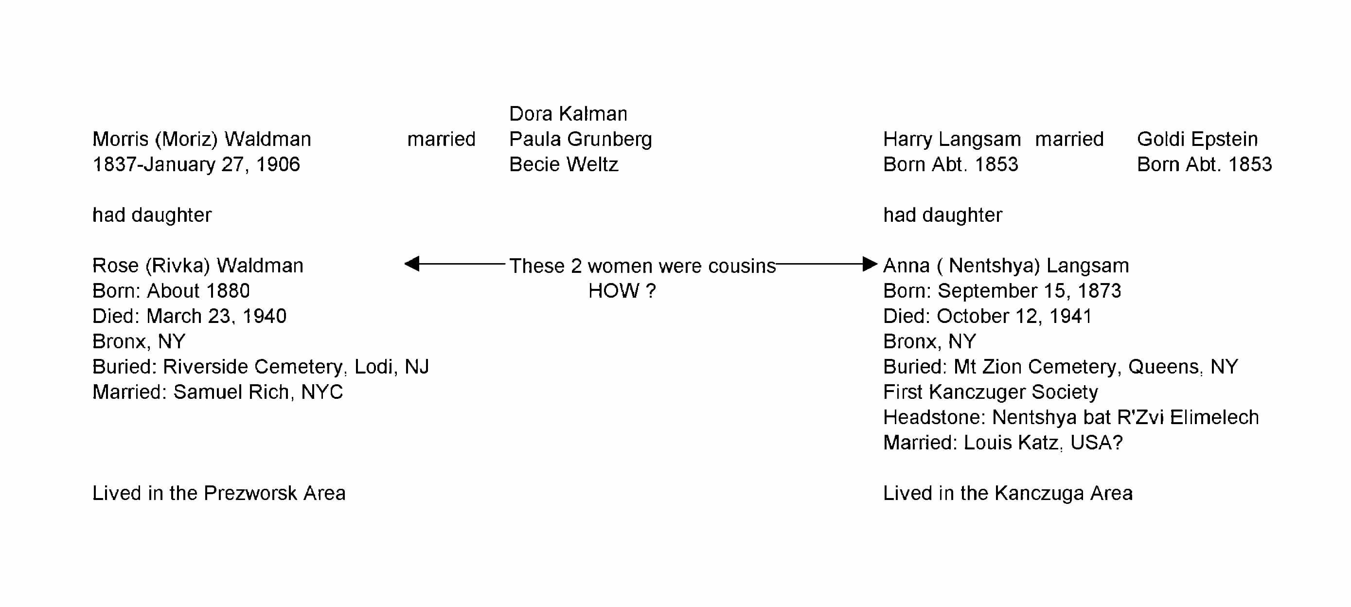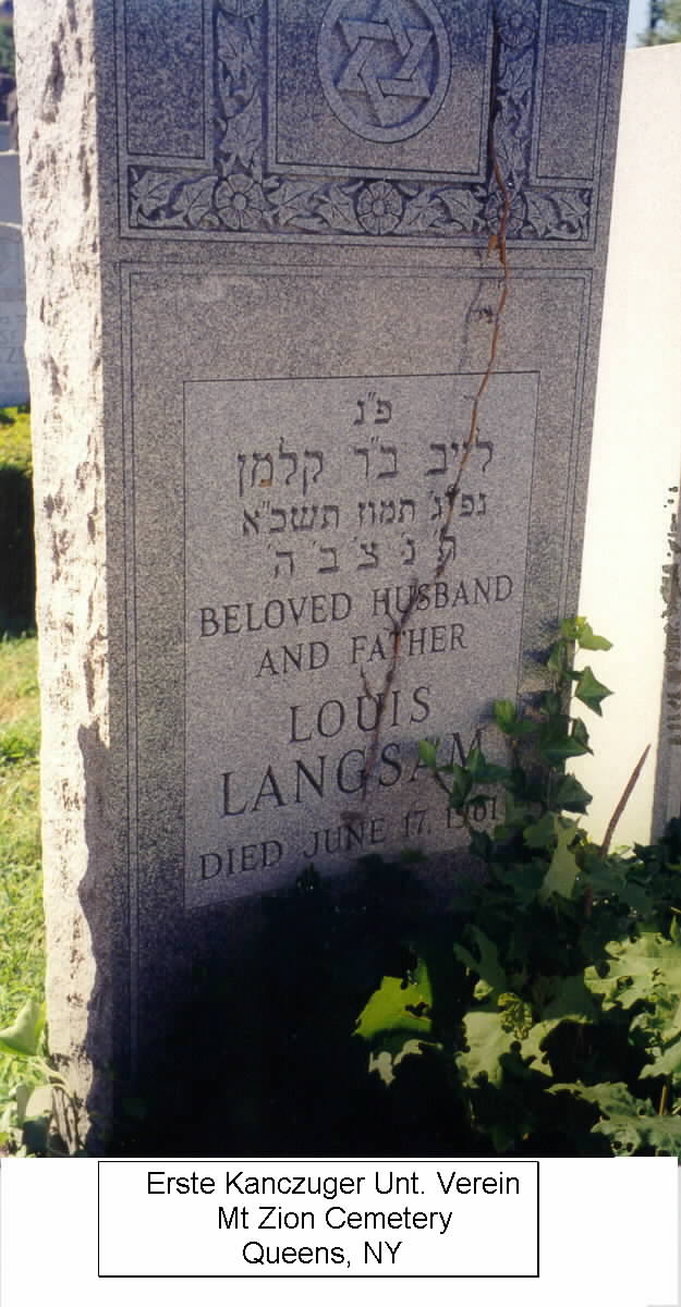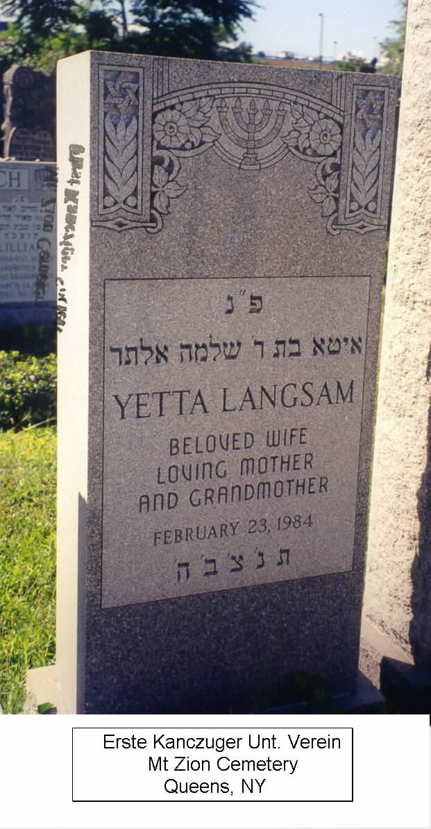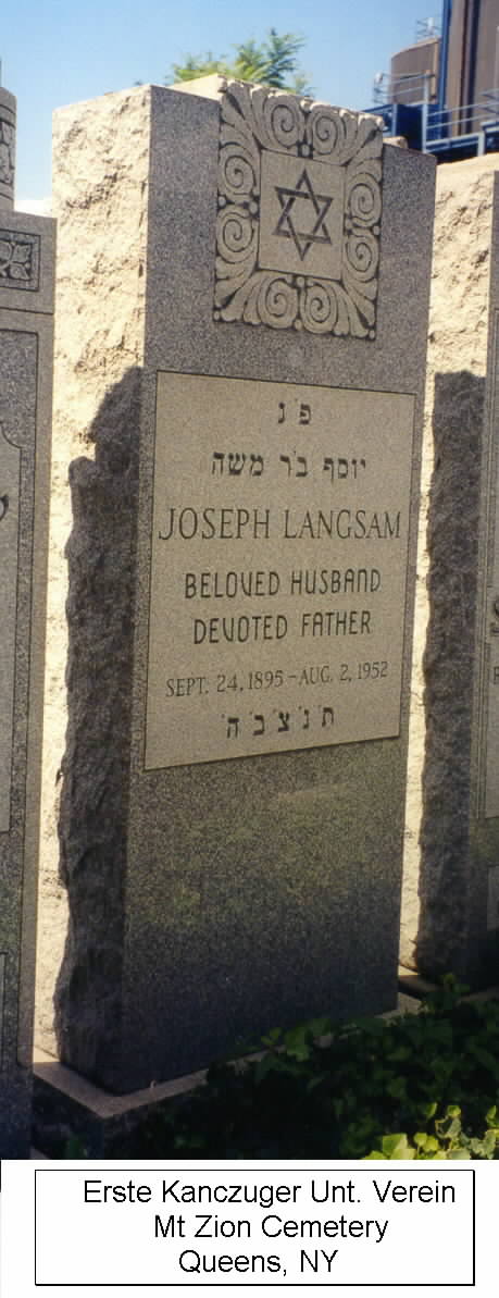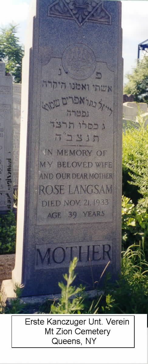 From: "Carolyn"To: Subject: Have A Langsam Inquiry Date: Tue, 1 Oct 2002 02:11:40 -0400 Hi Moishe, I am working on a tree for a fellow here on Long Island.(He has the tree, I have the computer) He has a Langsam family in the Bronx, and I couldn't find any information on your web page...So I'm hoping you have something in your database that will help tell me more about the family. I contacted Susan Wynne two years ago, and she wouldn't give me the time of day...forget any help or information. The attachment has all the basic info on it. I will be sending photo's of headstones to you hoping you can tell me more about the people. The photo's are marked. Thanks, Carolyn Putterman St. James, NY Cousins Rose & Anna.jpg ______________________________________________________ Date: Tue, 01 Oct 2002 23:53:20 -0400 To: "Carolyn" From: "moishe@langsam.com" Subject: Re: Have A Langsam Inquiry Dear Carol, I am fascinated by what you sent. I do not have a clear connection yet, but everything fits in with the family. We had MANY Hersh Mylech (Tzvi Elimelech) Langsam's in the family. Chunks of the tree came from both Kanczuga and Prezworsk.Can you provide siblings names or when these people came to the USA? Please stay in touch. I would be interested to see any other scans you might have. Thanks! Moishe ______________________________________________________ From: "Carolyn" To: Subject: RE: Have A Langsam Inquiry Date: Wed, 2 Oct 2002 02:02:39 -0400 Well Moishe, here it is...... Louis & Anna (Langsam) Katz both immigrated between 1888-1891. I haven't determined if they were married in Poland or here in NY. I found three Langsam ladies on the NYC marriage index, but none were Anna. (I do have copies of those marriage records) Their Children all born in NY Harry - 1894 - 1961 Irving - 1896-1962 Agusta (Gussie) 1898-1988 Charles - 1901-1979 Molly Esther - 1903-1996 Morris - 1911-living ========================================= Morris Waldman (his parents Joseph Waldman & Eva Berger) He immigrated in 1888. Some of his children came in with him, and others came in before 1891. From what I can determine, Rose Waldman and Anna (Langsam) Katz may have come in together. Further work to be done at NARA. The last one to arrive was Nathan in 1900 with a daughter Pauline. (Who does not show up on the Ellis Island DataBase, but I did find him on the Holland American Database at the NYCPL on microfiche). My main question about Nathan is, who was he living with in Poland if the rest of his family was here? Morris Waldman's headstone alludes to him being a Rabbi. He was not a Rabbi here, but a Kosher wine merchant on Attorney Street. Nathan born in Prezworsk, married a women from Krakow, a Reisner, who could also be a Rabbinical Family. I have always wondered if Nathan was in studies for Rabbinical work, and wasn't very good at it, and they threw him out….if that is possible. His Children that we know of….could have had more in Poland The range in DOB's kinda tells me he did have 2 wives and more kids. Louis - 1862-1910 Fanny - 1866-1950 Jenny - 1875-1938 Nathan - 1876-1944 Rose - 1880-1940 Molly - 1885-1944 Rose Waldman and Anna Langsam were VERY close. From family members who knew the ladies, "these two women were almost inseparable". They lived within 2 blocks of each other in the Bronx. Both families lived on the Lower East Side until the mid twenty's and moved "en mass" to the Bronx. I have six photos' I'll be sending to you. I don't read Hebrew hopefully you do. Maybe you can gleen some information from the stones. Morris Waldman's stone is hard to read in the photo's. The fellow who translated the stone was not good at it either. I sure would like a good translation some day. He is buried at Union Fields Cemetery, Sinavar Cong. Anche Sfaard - Section 54 - Row 1 Plot 5 I do thank you very much for getting back to me. Carolyn ______________________________________________________ From: "Carolyn" To: Subject: Anna (Langsam) Katz Date: Wed, 2 Oct 2002 01:55:06 -0400 Anna Katz.jpg Do you know anything about this fellow? Ephraim Langsam.jpg Do you know anything about this fellow? Joseph Langsam.jpg Look at the top of the headstone carefully..... Louis Katz.jpg Do you now anything about this lady? Rose Langsam.jpg Do you know anything about this lady? Yetta Langsam.jpg Do you know anything about this fellow? Louis Langsam.jpg Rose Rich.jpg ______________________________________________________ Date: Wed, 02 Oct 2002 22:26:59 -0400 To: "Carolyn" From: "moishe@langsam.com" Subject: Re: Rose Waldman Rich (Reich) The Hebrew: Mrs. Rivka, daughter of R' Moshe Passed away 13 Adar II 5700 ______________________________________________________ Date: Wed, 02 Oct 2002 22:28:09 -0400 To: "Carolyn" From: "moishe@langsam.com" Subject: Re: Louis Langsam At 02:00 AM 10/2/02 -0400, you wrote: Do you know anything about this fellow? Not offhand but I will research. Hebrew: Here lies Leib son of Kalman passed away on 13 Tamuz, 5761 (1961) ______________________________________________________ Date: Wed, 02 Oct 2002 22:29:07 -0400 To: "Carolyn" From: "moishe@langsam.com" Subject: Re: Yetta Langsam At 01:59 AM 10/2/02 -0400, you wrote: Do you know anything about this lady? Not yet. The Hebrew: Here lies Ita daughter of R' Shlomo Alter ______________________________________________________ Date: Wed, 02 Oct 2002 22:31:06 -0400 To: "Carolyn" From: "moishe@langsam.com" Subject: Re: Rose Langsam At 01:58 AM 10/2/02 -0400, you wrote: Do you now anything about this lady? Not yet. Hebrew: Here lies my wife and our mother Raizel daughter of R' Ephraim Shmuel passed away on 3 Kislev 5694 ______________________________________________________ Date: Wed, 02 Oct 2002 22:33:41 -0400 To: "Carolyn" From: "moishe@langsam.com" Subject: Re: Louis Katz At 01:58 AM 10/2/02 -0400, you wrote: Look at the top of the headstone carefully..... That is the symbol of the Kohain blessing the people. Katz is an abbreviation for "Kohain Tzedek" - righteous Kohain. Hebr