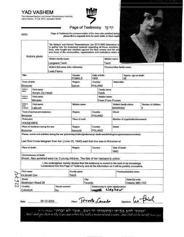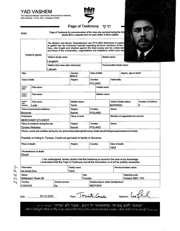 =========================================================== Subject: 28-Leah Teich to Joel Teich Letter to translate 8.pdf From: moishe.miller@totalben.com Date: Wed, Nov 09, 2016 8:52 pm To: "Ira Teich"28-Leah Teich to Joel Teich Letter to translate 8.pdf seems to show that Leibush was: - Moses Leib - born 1904 (22 December?) - to Meir (sp?) and Chayki (nickame for Chaya) nee Frankel Moishe Miller =========================================================== Subject: Re: Langsam, Leibush and wife Pessel (nee. Teich) From: Ira Teich Date: Wed, Nov 09, 2016 7:55 pm To: moishe.miller@totalben.com Yes I do. This record is wrong. Pesel was Leah's sister. Both were my aunts. It was Leah who was married to Leibush Langsam, not Pesel. Leah and Leibush were both killed in ww2. Pesel emigrated to Palestine in the 1930s. She contracted malaria there. Her brother, my father, Joel brought her to toronto for treatment in 1938. Sadly she was killed in a traffic accident in toronto in 1938 while crossing a street on her way to an oneg Shabbat. She is buried here in toronto. Ira Teich =========================================================== Subject: Langsam, Leibush and wife Pessel (nee. Teich) From: moishe.miller@totalben.com Date: Wed, Nov 09, 2016 7:49 pm To: "Ira Teich" Hi, Do you know them: